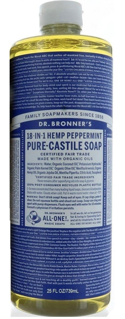 That’s all I recall of the encounter. And through it all, I honestly remember the soap more than the girl. It made enough of an impression on me to seek it out to use on my own future backpacking trips–and, when I stopped backpacking for a time, to use it in real life. Yet, like my backpacking excursions, my use of Dr. Bronner’s also eventually stopped–until I brought it back into my shower and my life last year.